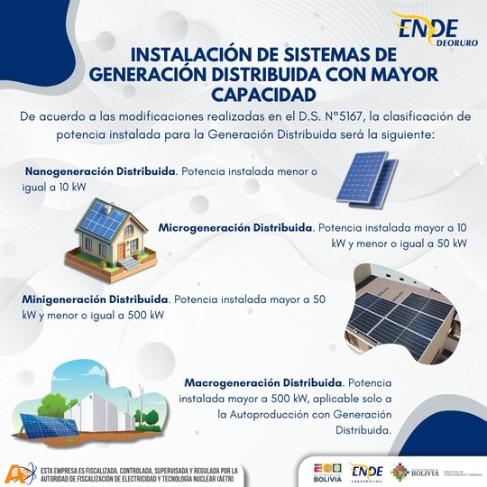 De acuerdo Decreto Supremo N°5167, la capacidad de generación se organiza en las siguientes categorías: