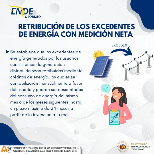 De acuerdo con el Decreto Supremo N.º 5167, la retribución por Generación Distribuida se realiza mediante medición neta, considerando el balance entre la energía que consumes y la que inyectas a la red.